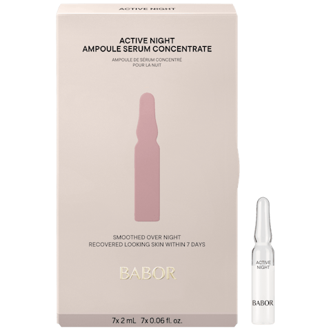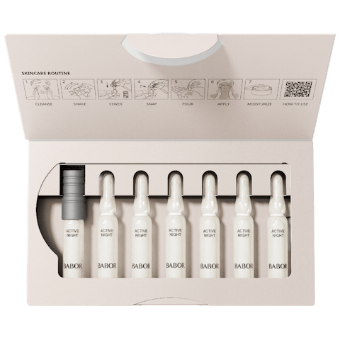 Ampolletas faciales Active Night BABOR, tratamiento nocturno dermatológico que regenera, hidrata y reduce arrugas, para una piel más firme, suave y radiante al despertar.